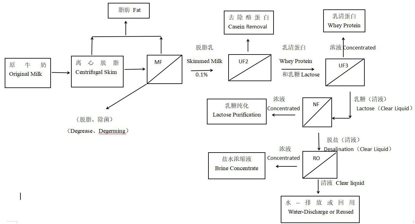La tecnología de microfiltración de membrana puede reemplazar la pasteurización y los conservantes químicos, interceptando eficazmente bacterias, levaduras y moldes en productos lácteos, permitiendo que los ingredientes efectivos en los productos lácteos penetren y tiene la ventaja de la esterilización en frío. La leche fresca se desnatada y la leche descremada se filtra a través de una membrana de microfiltración. Finalmente, la leche descremada filtrada y esterilizada se esteriliza a 80 ℃/6s para inactivar las enzimas en la leche y evitar la degradación de la leche causada por la descomposición de la proteína durante el almacenamiento. Este proceso adoptado se puede mantener fresco a temperatura ambiente y tiene el mismo sabor que la leche esterilizada. Este sistema de esterilización compuesto que combina la tecnología de membrana con otras tecnologías reduce la intensidad de tratamiento térmico de la leche, al tiempo que garantiza el efecto de esterilización, también puede mantener el sabor original de la leche fresca y evitar la desnaturalización térmica de la proteína, Mejorar eficazmente la calidad y la vida útil de los productos.
