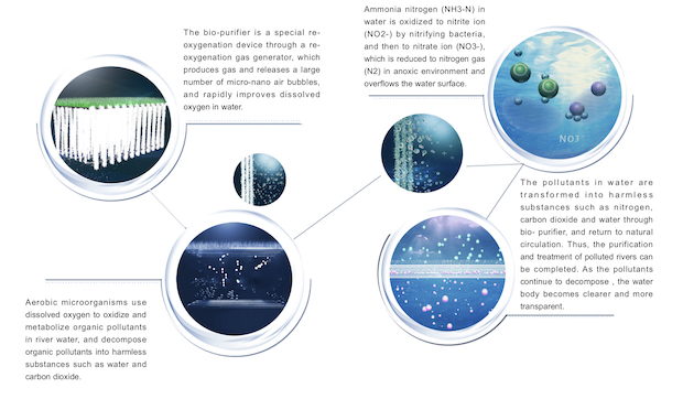 El bio-purificador para el río y el lago es un sistema de biorremediación desarrollado por nuestra compañía para la purificación eficiente del agua del olor Negro y del agua superficial peor que el grado V, que integra varias características técnicas de biorremediación de agua de río y tiene una serie de patentes de investigación y desarrollo.